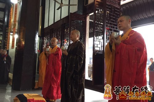 中午,菩萨戒法会正式开始,四众弟子身穿海青恭敬站立, 维那师起腔《杨枝净水赞》,梵呗声起,首先迎请重庆华岩寺方丈道坚大和尚为得戒和尚,华岩寺监院义悲法师任羯磨阿阇黎,重庆佛学院证性法师任教授阿阇黎,为汝等作戒会见证人共证菩提,为在家善男信女传授三皈五戒居士菩萨戒。道坚大和尚拈香礼佛,朗声诵《净水赞》:“菩萨柳头甘露水,能令一滴遍十方,腥膻垢秽尽蠲除,令此坛场悉清净。