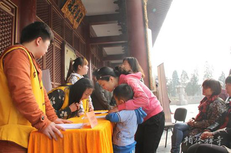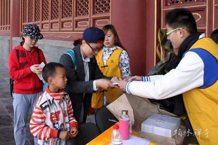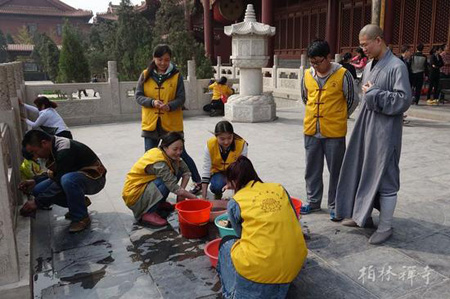 2015年4月11日上午9点,河北省赵县柏林禅寺为前来寺院的游人、香客组织的“修福体验”活动正式启动。此次活动由监院利生法师主持,柏林禅寺部分义工负责组织引导工作。