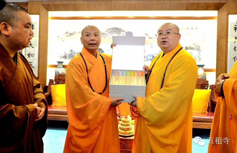 参观完寺庙后,慧传法师与明基法师、正慈法师进行了座谈交流,双方叙旧言欢,相谈甚洽。黄梅县委书记余建堂向慧传法师赠送了黄梅挑花《报春图》、黄梅戏《传灯》全套光碟;正慈法师代表五祖寺也赠送了清代东山仙山盛境全图画轴和琉璃宝钵等礼品。慧传法师回赠了星云大师的著作等纪念品。
