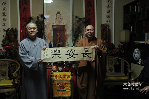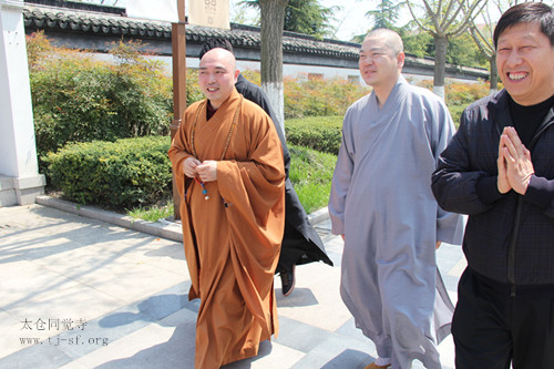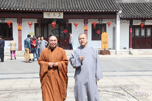 2015年4月10日中午,结束了数天阴雨连绵的天气,迎来了阳光明媚的春暖花开。似乎也是佛光普照,欢迎远方的朋友。台湾灵岩山寺住持自毅法师一行数人参访太仓同觉寺。同觉寺方丈曙提法师热情接待了远道而来的客人。