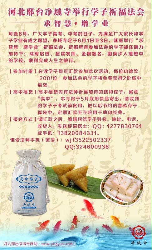 【参加对象】在读学子即可汇款参加此次活动,每位功德款200/位,参加法会的学子将免费获得2份高中福袋。