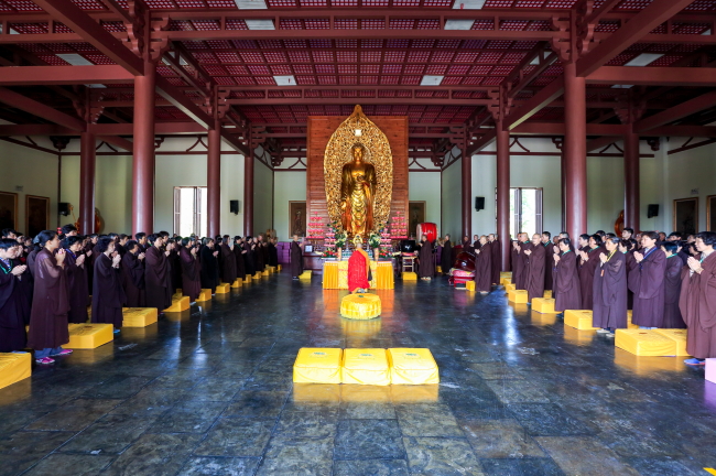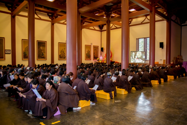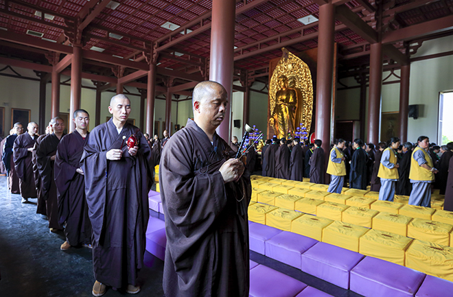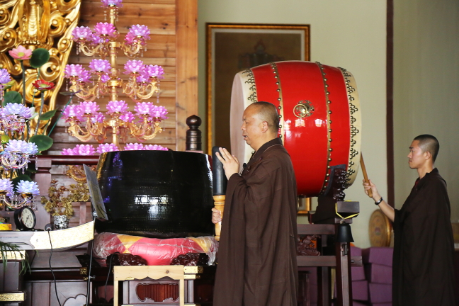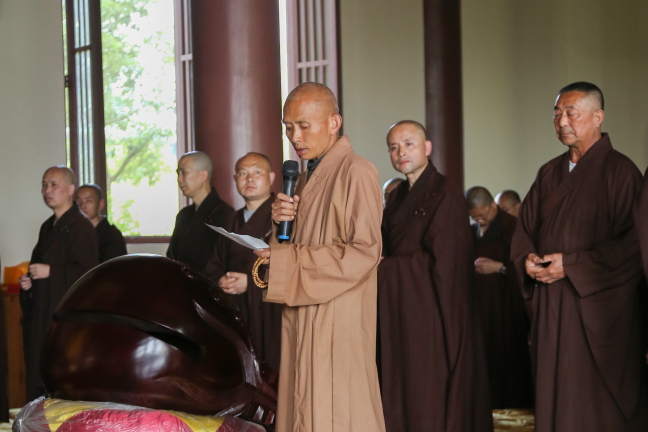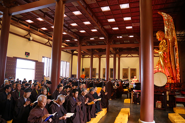 15时半,僧值齐圣法师就佛七规约、东林佛号唱念方法及相关注意事项对大众作了精要开示。紧接着,起七仪式正式开始。一时间,念佛堂内,钟磬清越,鼓乐齐鸣,《莲池赞》、《佛说阿弥陀经》、《赞佛偈》及“南无阿弥陀佛”名号等清幽梵唱将与会大众带入了一个清净祥和的境地。