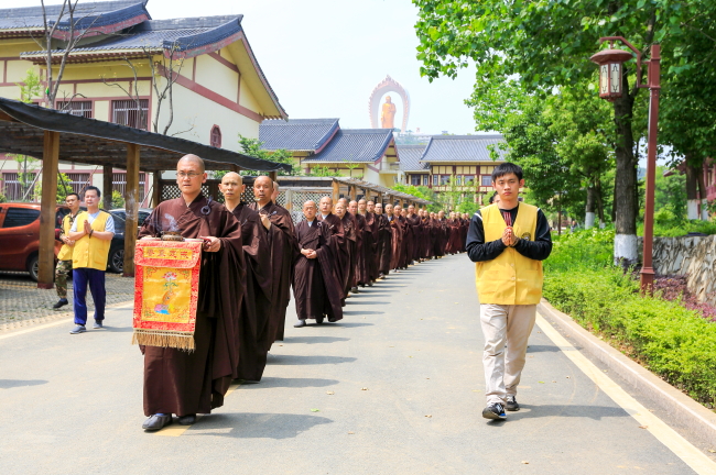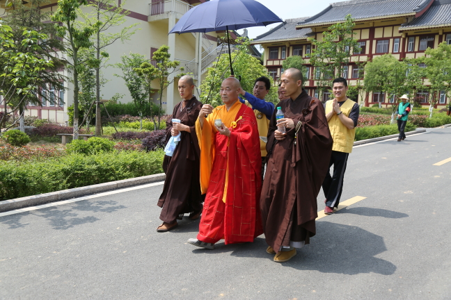此时的净土苑,将临夏令,骄阳似火。13时半,由净土苑首座悲如法师拈香主法、维那法照法师领众唱念,于念佛堂举行了隆重的洒净仪式。庄严古雅的念佛堂内,檀香袅袅,梵唱声声,《杨枝净水赞》、《大悲咒》及“南无观世音菩萨”圣号等梵唱声响彻于佛堂内外。随后,逶迤的僧伽队伍游行于各堂口,杨枝落处,甘露遍洒,悉使罪灭愆消,坛场清净。