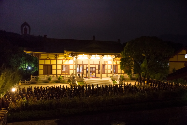 晚7时许,念佛堂外的殿前广场,华灯璀璨,月白风清,一派清朗明悦的气象。大众沐浴着习习晚风,于此逶迤经行,一声声饱含深情的“南无阿弥陀佛”六字万德洪名响彻云霄。声声佛号寄托了娑婆众生对弥陀慈父的殷切思念,虔敬情怀表达了三界浪子对极乐故乡的向往之情。