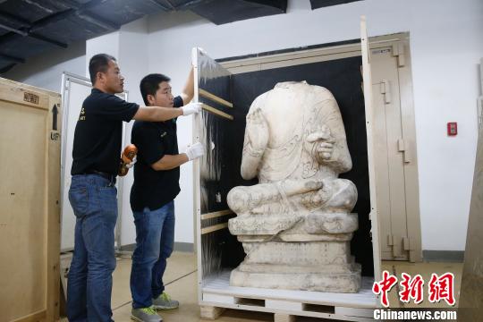 来自河北幽居寺的北齐时期释迦牟尼像佛身在5日的点交现场中新社记者杜洋摄