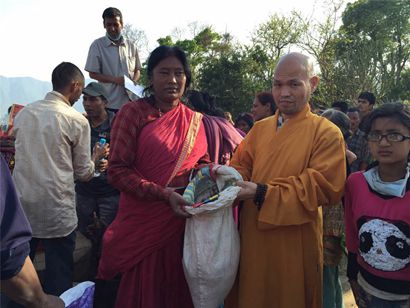 本次救灾队伍共为灾区送去了方便面120箱,矿泉水30箱,帐篷24顶、大米1吨。智空法师、果藏法师、合源法师等小队成员现场将物资分发到灾民手中,在尼泊尔比丘协会的共同努力下,现场秩序良好,灾民排队领取物资。孩子们脸上灿烂的笑容是给救灾队伍最好的礼物。领到物资的灾民们脸上生出笑意,并要求与队员们合影,对救灾队伍的到来表示由衷地感谢。(文:南海佛教 图:顿博)