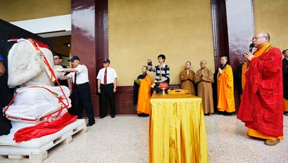 原保存于河北博物院的释迦牟尼佛佛身,5月4日由北京启程,15日深夜抵达佛陀纪念馆,21日在佛光山大雄宝殿正式开箱。由于佛身高100公分、重达1千4百公斤,专业工作人员非常慎重,先后出动了特别铺上气垫的货柜车、吊车和堆高机,以最细腻轻柔的严谨动作,圆满开箱和安座任务。