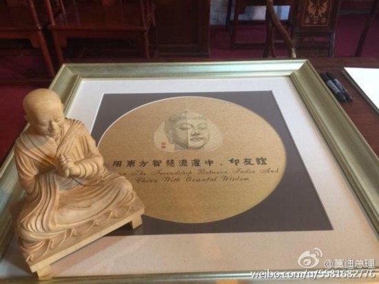 2015年5月15日,印度总理莫迪在中文微博晒出送给习主席的礼品照片,莫迪送给习主席在古吉拉特邦瓦德纳贾尔考古遗址的图片和佛教遗址的复制品。