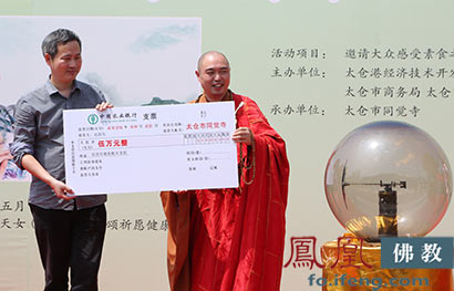 开幕式上,同觉寺还通过太仓市慈善总会向震区捐款5万元,为震区尽点绵薄之力。(图片来源:凤凰佛教)