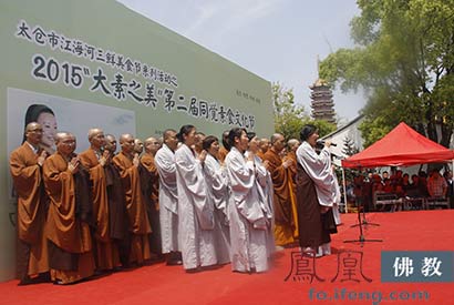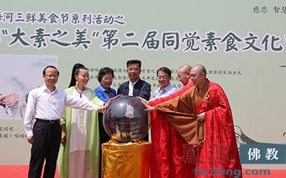 5月1日,2015“大素之美”同觉寺第二届素食文化节开幕。江苏省佛教协会副秘书长、宝华山隆昌律寺方丈心平大和尚,同觉寺方丈曙提法师,太仓市政协主席邱震德,太仓市市委常委顾晓东,太仓市政协副主席朱薇圆,太仓市统战部部长高扬,以及著名佛乐歌唱家、妙音天女敬善媛一起为素食节启动开幕球。(图片来源:凤凰佛教)
