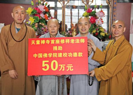 此外,天童寺首座修祥老法师向中国佛学院捐助50万元,用以佛学院建设、僧才培养。