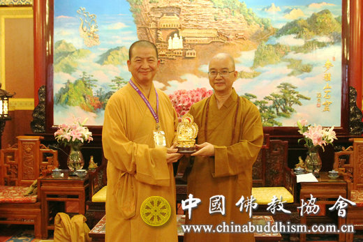 会见结束后,学诚会长代表中国佛教协会向明光法师赠送佛像