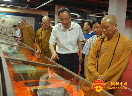 下午一点左右,南华禅寺方丈传正大和尚在曹溪讲坛接待了调研组一行,随后在监院法祇法师的陪同下,调研组员和法师们参观了曹溪讲坛和南华禅寺,在难得对外开放的藏经阁顶楼上,调研组瞻仰了六祖大师使用过的坠腰石、锡杖、金砂念珠等宝物。在六祖殿内,心澄大和尚等三位法师欢喜瞻仰六祖大师的真身,并虔诚礼拜。在参观了曹溪佛学院之后,顾传勇副局长赞叹道:“全国像南华禅寺规模这么大、配备设施这么齐全的寺庙确实少见!”