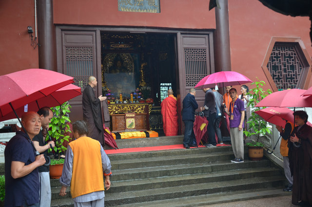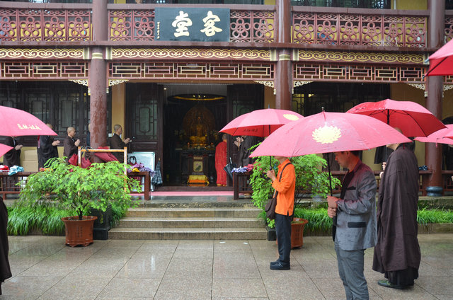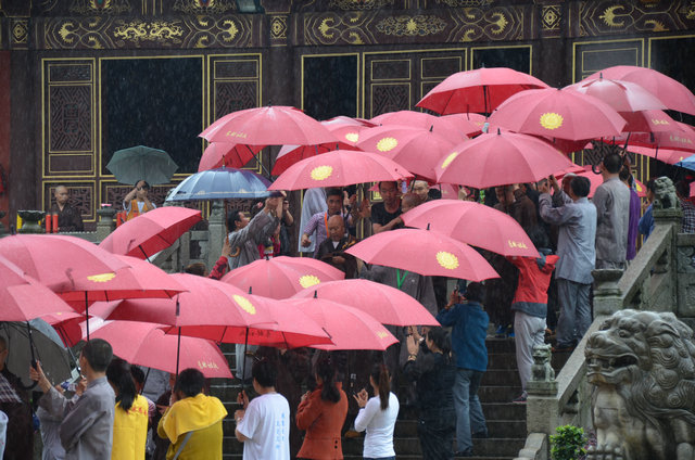 上午供佛时,正下大雨,众人自发地打伞站立道路两边,排成伞阵,为他人遮雨