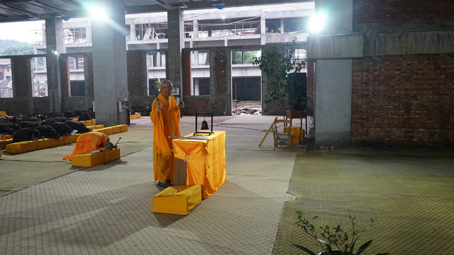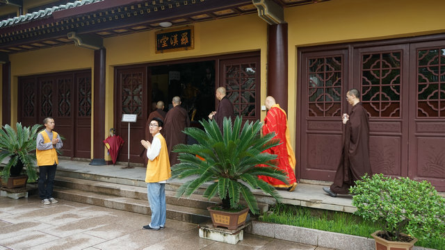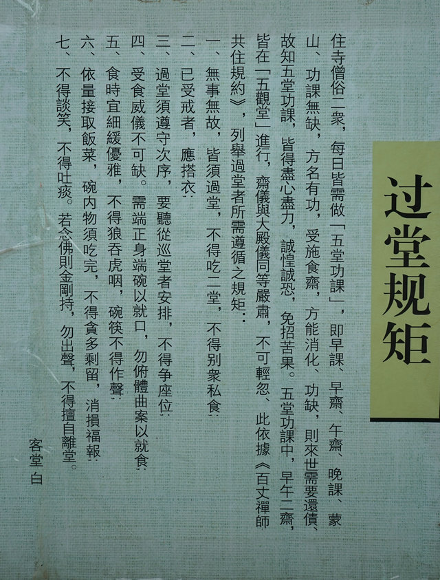 净坛结束,紧接着,开堂师父请东林寺西堂定圆法师为戒子讲解在寺院要遵守的一些规矩。定圆法师首先讲解了居士在寺院要遵守的一些基本规约。如在寺院要恭敬佛法僧三宝,有恭敬心才能得到佛法的利益。不允许在寺院内抽烟、喝酒、吃荤腥食品。不听不唱流行歌曲,乃至打牌、下棋等娱乐活动都不允许。不随便串寮闲谈,不允许私自聚众。不谈论是非,更不可恶口骂詈。要爱惜常住物,节约水电。晾晒衣服、被子要在合适的地方,不能随便乱搭。天气炎热,在室外要保持衣着的整洁、庄严,不能穿一些透明的服装。不随地吐痰。等等。接着,定圆法师讲解了一些殿堂规矩、听法规矩、过堂规矩等。如进入殿堂时要从门的两侧进入,不可走中央。殿堂是庄严的场所,除了经书、一些供养物之外,不要带其他东西进入。不可将殿堂当过道,任意地游走、穿梭。在殿堂内,不说世俗言语,不大声喧哗。站立时不能支脚、倚壁、靠桌、叉腰。对戒本等法宝要恭敬,要用双手恭恭敬敬地捧着,不可乱丢乱放,不能夹在腋下,或是走路时边走边甩,或是卷成筒状。参加念佛、听法等共修活动时,要提前十分钟到场,不能迟到早退,要关闭手机。听法时要专心,不东张西望、散心杂话。进入斋堂时要排队,要学会一些斋堂常用手语。吃饭时不抓挠头发,以免头皮屑掉落,令邻桌生恼。吃饭时要手端着碗,不能趴在桌上吃。穿海青、搭缦衣行走时,手要端着,放掌或合掌,不要边走边甩手,上下楼梯注意撩衣,以免自己或别人踩到。定圆法师还谈了居士学佛的一些行仪。如见到佛像应礼拜,至少也要问讯、合掌。在殿堂经行或绕塔时要右绕,不能左旋。见到出家师父,应端身正立。不可以随意进入僧寮。睡觉时要右胁卧。等等。至4时45分,定圆法师讲解规矩结束。戒子稍作休息,随后念佛至5时。