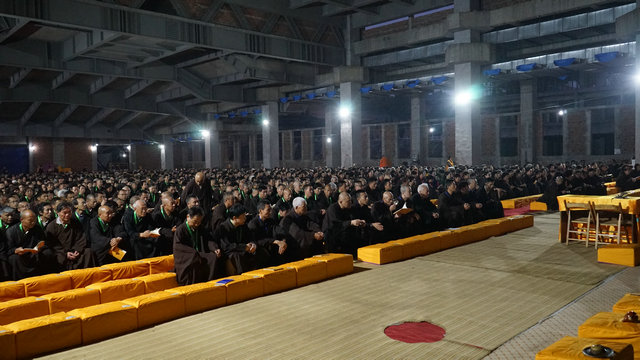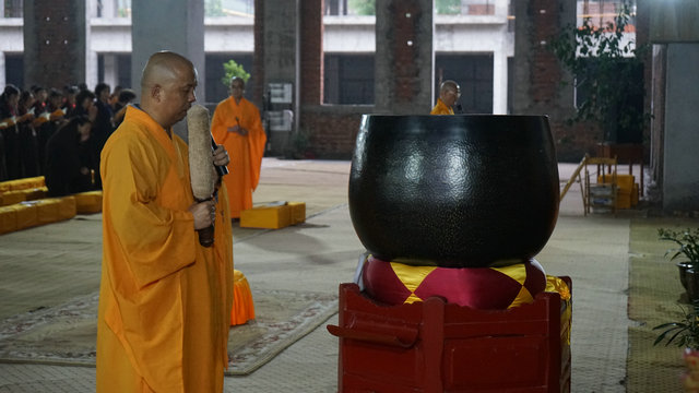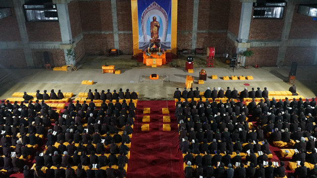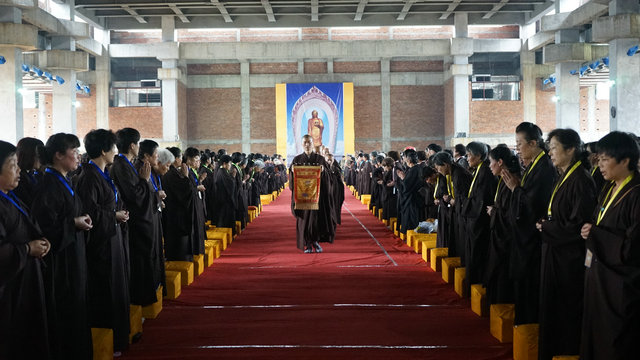 此次菩萨戒因报名人数众多,有一千六七,香光讲堂一楼的念佛堂不能完全容纳,所以戒堂设在空间更大的大念佛堂。下午1时30分至2时20分,东林寺方丈大安法师在戒堂主持了净坛仪式。在出家师父的引领下,众戒子唱《杨枝净水赞》,称大悲观世音菩萨圣号,讽诵大悲神咒。同时,洒净队伍出堂,依次对居士斋堂、香光讲堂一楼念佛堂、大雄宝殿、西罗汉堂、方丈室、观音殿、法堂、远公堂、老念佛堂、五观堂、东罗汉堂、天王殿等处进行了洒净。随后,洒净队伍返回戒堂。大众诵十小咒、《般若波罗蜜多心经》,称“摩诃般若波罗蜜多”,唱《观音赞》,最后进行了净坛功德回向。