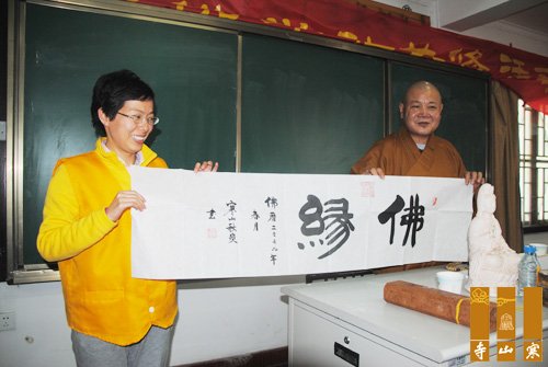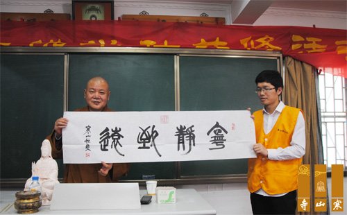 最后秋爽大和尚向学员提问,首先回答正确的学员得到秋爽大和尚的墨宝相赠,学员们争相回答,最后有三位学员分别得到“佛缘”、“海纳百川”及“宁静致远”三幅墨宝,让学员欢喜无量,大家也用热烈的掌声表达对秋爽大和尚的敬意。在这一片欢喜中,为期三天的五一共修活动圆满结束。