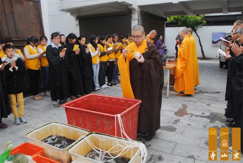在三天里,寒山寺青年佛学社为学员安排了丰富多样的学修活动。心良法师的“丛林规约”讲座,能持法师的“金刚经”讲座,智海法师的“皈依的意义及重要性”,明空法师给学员做了禅修指导并带领大家禅修,明空法师和能持法师还回答了学员提出的问题。学员们随寒山寺常住参加早晚课诵,受持八关斋戒,抄写佛经,禅修,念佛绕普明佛塔,晚上佛前大回向。最后一天还在上塘河边举行了放生法会,并为学员祈福回向。