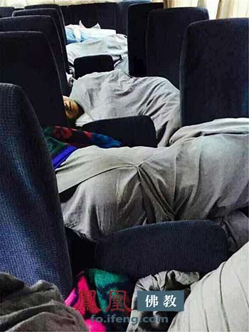 连夜兼程的学员们,在车上小憩。(图片来源:凤凰佛教 摄影:来定)