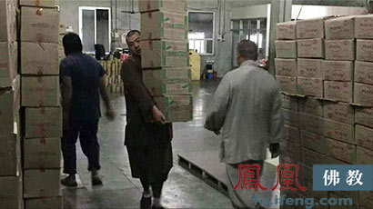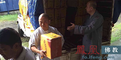 紧急将赈灾物资装车(图片来源:凤凰佛教 摄影:来定)