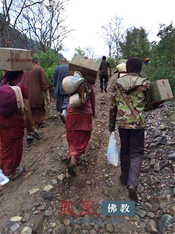 领取到救援物资的灾民,沿着崎岖的山路回家。(图片来源:凤凰佛教 摄影:来定)