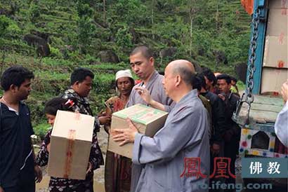 法师们向灾民发放救援物资(图片来源:凤凰佛教 摄影:来定)