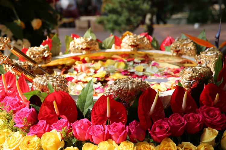香花迎,香花请,僧众焚香,童子撒花,上传下喜法师恭迎太子佛。