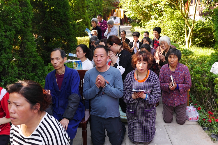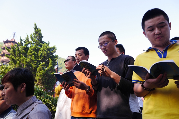 上海的小居士唱《观音菩萨偈》,“观音菩萨妙难酬,清净庄严累劫修,三十二应遍尘刹,百千万劫化阎浮,瓶中甘露常时洒,手内杨柳不计秋,千处祈求千处现,苦海常作渡人舟”。