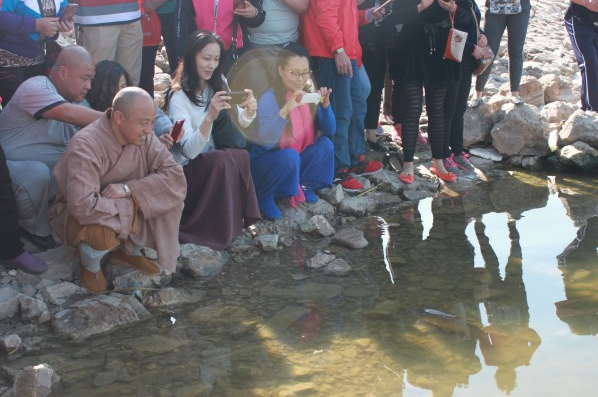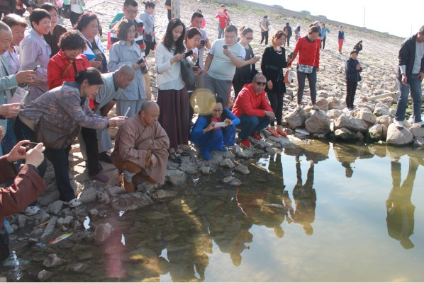 在大家齐心协力之下,将所有的鱼类放入水中,其中一条鲤鱼从远处慢慢地向上昌下义大和尚游了过来,停在了距离一米远的地方,默默地注视着岸边,用无声的语言来表达着感激之情,感恩人们的善德善行,使许许多多的鱼类免遭屠刀地杀害,大和尚挥了挥手说:“走吧!走吧!向深处游吧!”过了一会儿,鲤鱼又慢慢地向深处游去。当时,人们见到这一情景,纷纷围了过来,拿出手机记录下这一珍贵的瞬间。