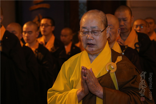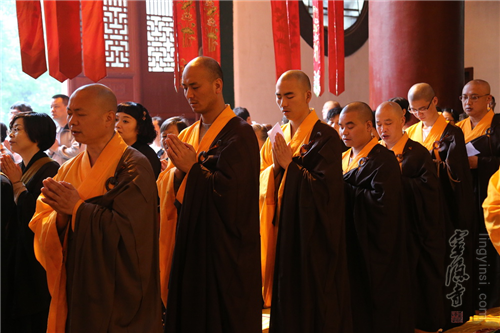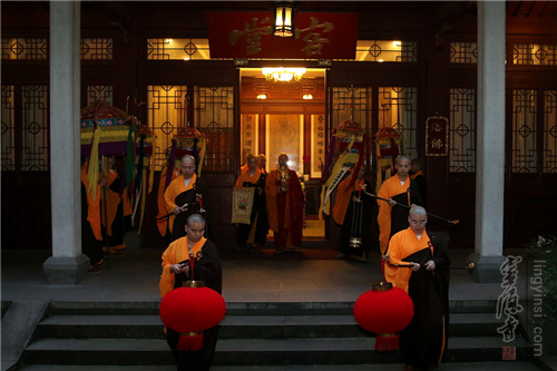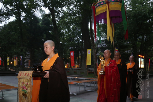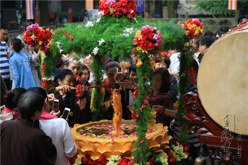 5月25日,灵隐寺举行隆重庄严的浴佛法会,纪念伟大的人天导师释迦牟尼佛诞辰。一大早,方丈光泉大和尚率众将镏金太子圣像迎请至大雄宝殿,恭敬安放于早已精心装饰的九龙金盆之中。