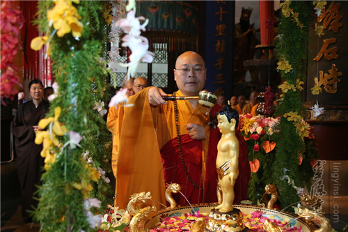 光泉大和尚领众三勺,以五色鲜花成就的香汤浴灌释迦太子金身。随后,大众法师、信众居士依次举勺,九龙圣水,次第浴佛,共祈慈悲佛陀,福泽社会,消灾弭难,我及众生,离苦得乐,究竟圆满。