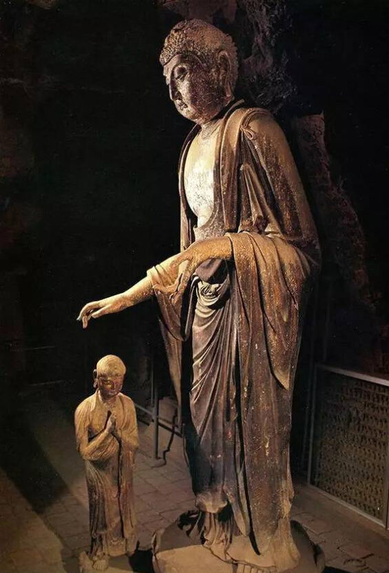 在麦积山石窟中,这组造型价值最高,也最成功。佛的手从臂膀上垂下来,柔若无物,如同生怕碰到什么一般,柔和得让人担心能不能坚持太久。罗睺罗尊者的虔诚需要佛陀的关爱,这又是一种情感的相互交流。佛陀用这种安慰来坚定罗睺罗尊者出家修行的决心,既有父子间慈爱的表达,又有法王希望弟子去坚强努力地承担的鼓励。