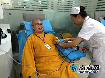 释德超法师正在捐献血小板(图片来源:三亚新闻网 摄影:刘丽萍)