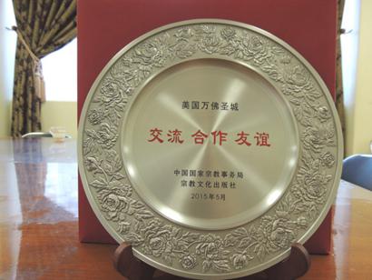 任继春此行来美,主要是前往纽约参加2015年中美国际书展。同行尚有宗教文化出版社发行部主任李松,编辑部主任王志宏、张秀秀, 及总编室编辑主任马硕。 一行人于书展后从纽约专程前来万佛圣城参访,并致赠镌刻“美国万佛圣城交流合作友谊中国国家宗教事务局宗教文化出版社2015年5月”的锡制纪念盘,以及宗教文化出版社的纪念笔等礼物。恒律法师也以宣公上人语录“金刚棒喝”等书及法界大学礼品等回赠。