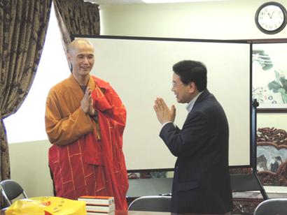 任继春与万佛圣城方丈恒律法师相互合十致意