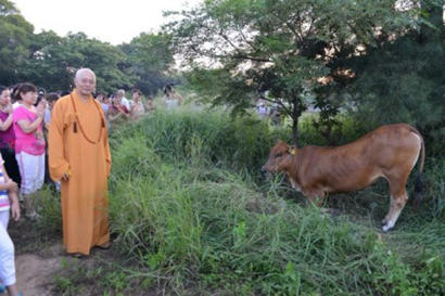海涛法师领众放生,怀孕黄牛下跪感恩