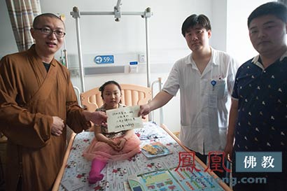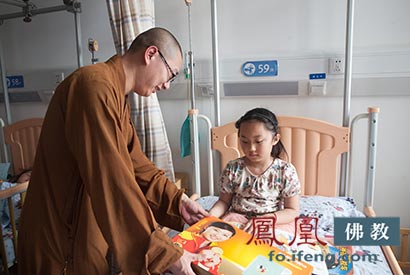上海觉群文教基金会副秘书长曙东法师看望陈馨悦小朋友(图片来源:凤凰佛教)