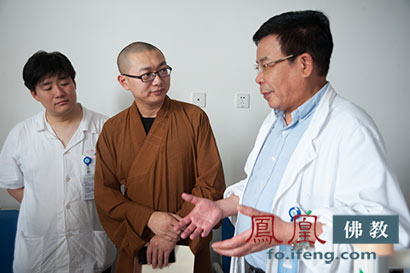 新华医院医生向曙东法师介绍陈馨悦病情(图片来源:凤凰佛教)