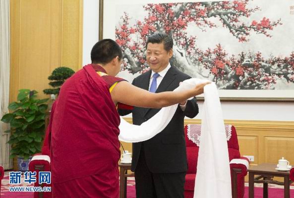 6月10日,国家主席习近平在北京中南海接受十一世班禅大师拜见,班禅大师向习近平敬献哈达。(图片来源:新华社摄影:兰红光)