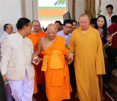 泰国副僧王帕·蓬玛西提长老是中国佛教界的老朋友,曾经多次来中国参访交流,并在深圳弘法寺接本焕长老法脉,取法名印和。印顺大和尚与印和师兄相互合掌,老朋友相聚,共叙法谊。印顺大和尚率全体本焕学院执事班学员法师出席帕·蓬玛西提长老升座大典。这些法师从尼泊尔中华寺直接奔赴金山寺,他们在赈灾中的表现获得中外嘉宾的一致赞赏。大和尚向长老表示祝贺,见证双方长期以来结下的深厚友谊。印顺大和尚赠送帕·蓬玛西提长老手书“方丈”牌匾,以示隆重。该牌匾将作为帕·蓬玛西提长老方丈室的匾额,两位大德惺惺相惜,友谊万古长青。