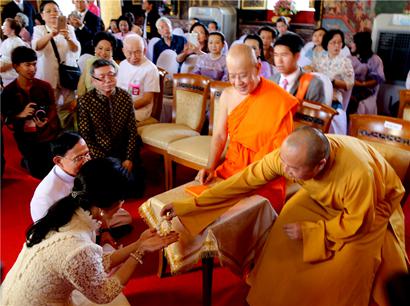 泰国前总理英拉双膝跪地接过印顺大和尚赠送念珠。摄影:顿俊