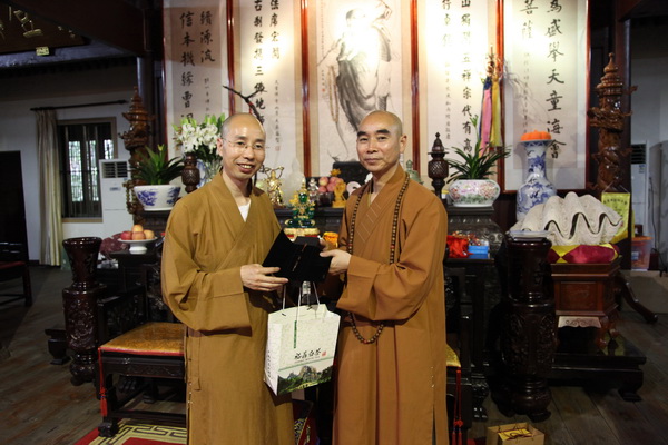 诚信法师对界悦法师一行的到来表示欢迎,对法师及各位护法居士表示亲切问候。诚信法师向界悦法师一行介绍了天童寺的历史文化。他说,天童寺是曹洞宗祖庭道场,历史上在宋代时住有2000多僧人,可谓佛光辉耀,丛林兴盛。他希望香港佛教界多来天童寺参访学习,进一步增进天童寺与香港佛教界的佛教文化交流。