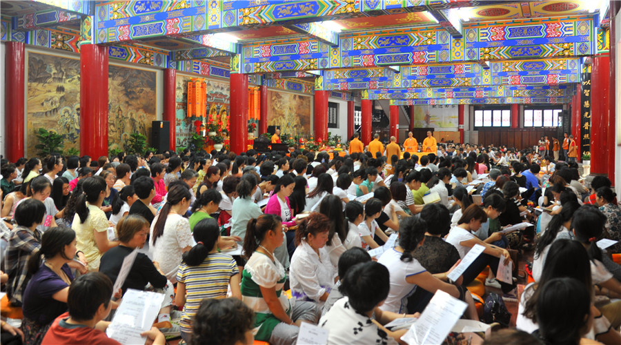 早上九点,文殊阁一楼内座无虚席,500多名善信欢聚一堂。皈依法会正式开始。