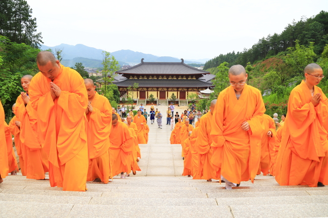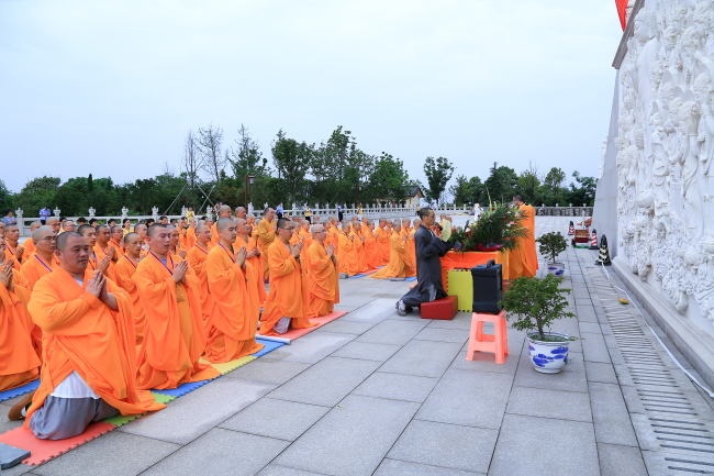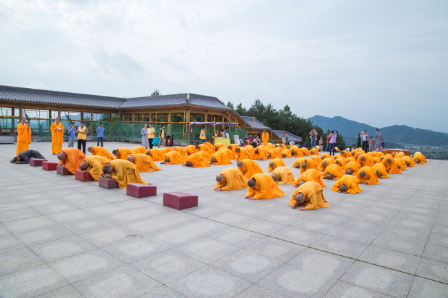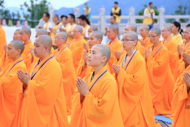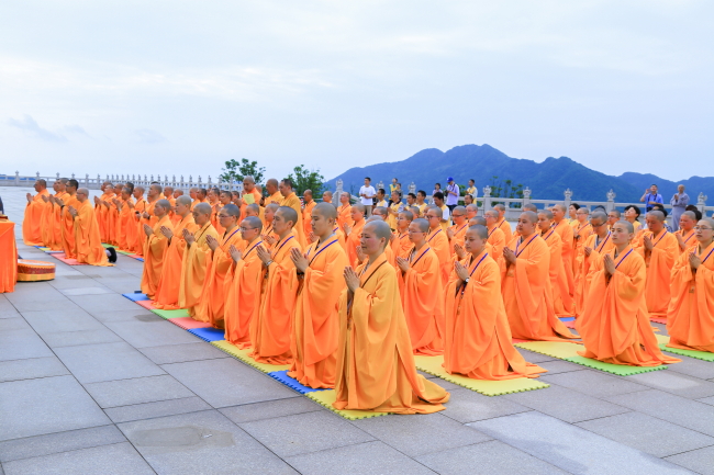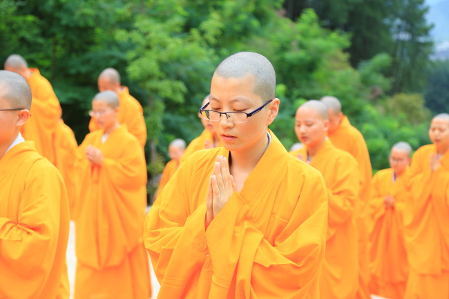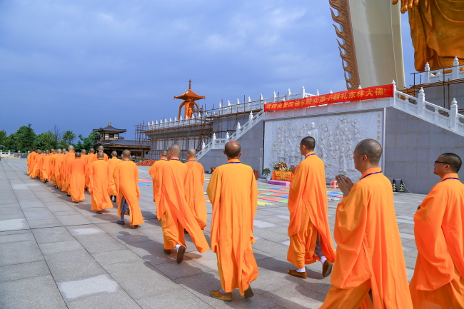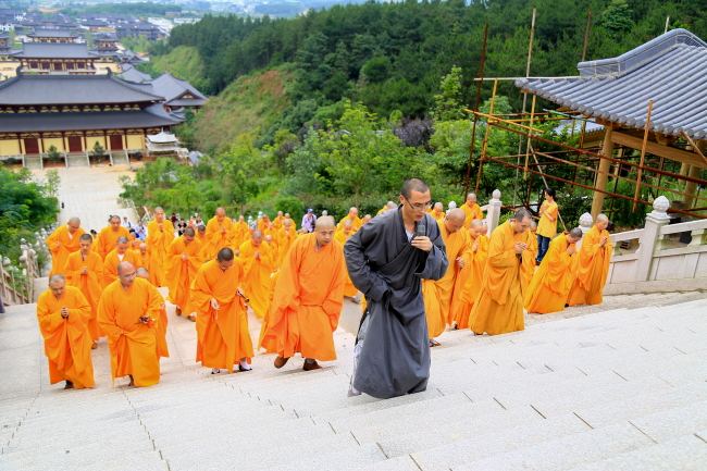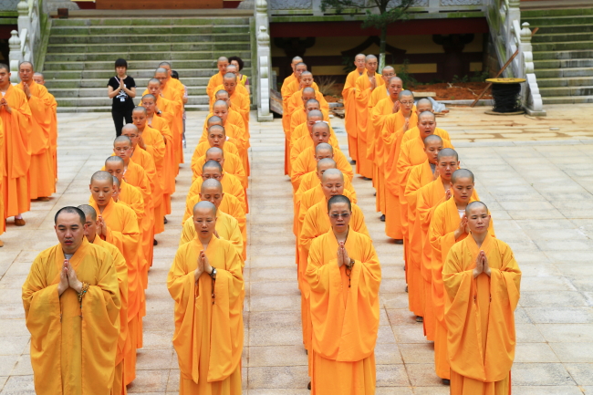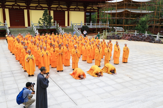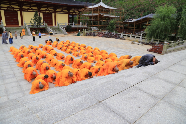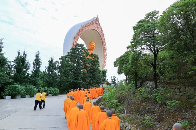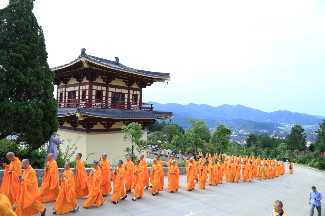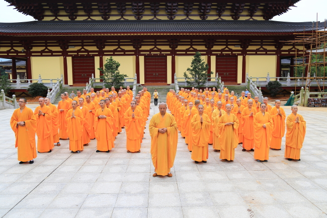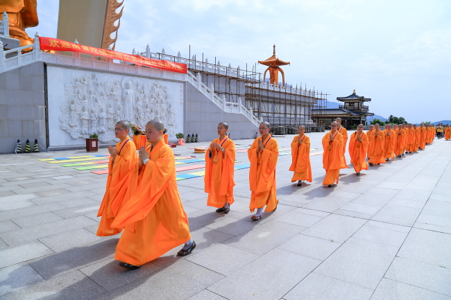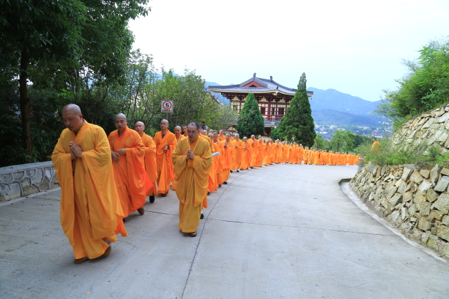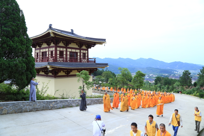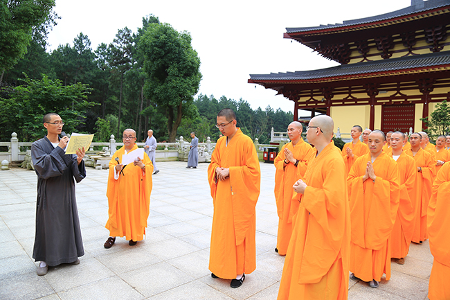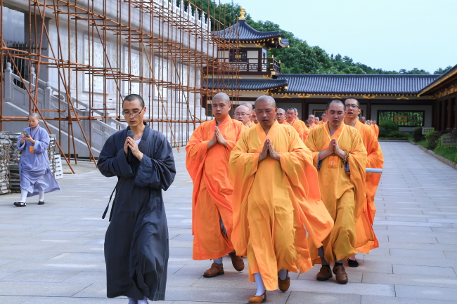 七时许,全体学僧身穿清一色的黄色海青,飘逸脱俗,端严清净,在大雄宝殿后的广场上整装待发。