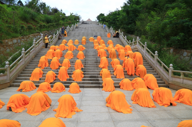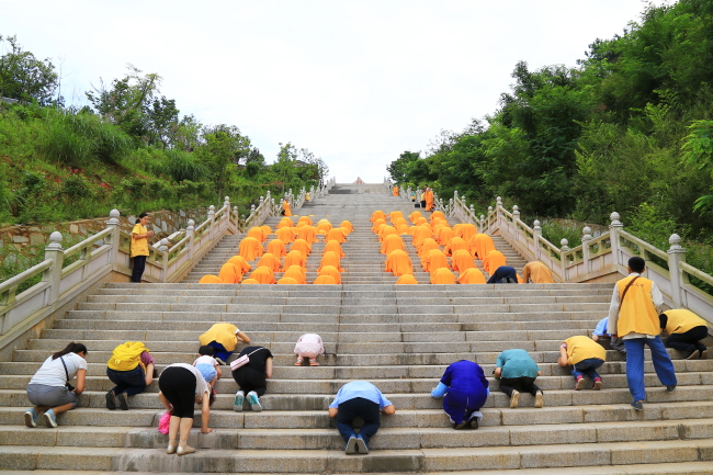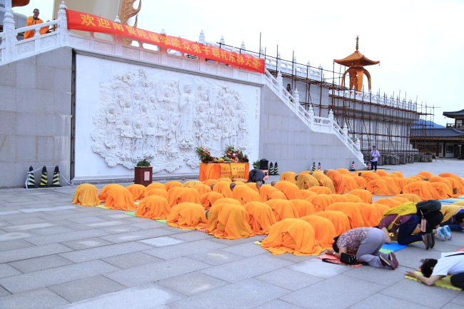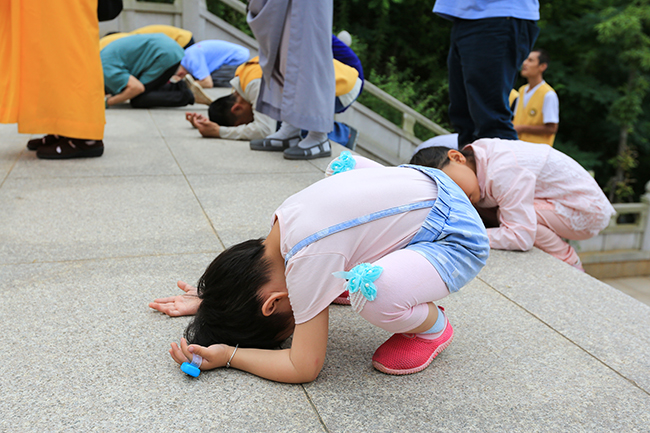 维那口宣佛号,引磬之音清扬,伴随着佛号磬音,学僧们头面礼足,虔觐弥陀。朝拜过程中,学僧们体现了良好的素养,富有节律,起伏有度,于信愿路上匍匐出一幅唯美的画面。壮观的声势赢得了良好的眼缘,引来不少游客的驻足围观,有不少人自发加入到礼拜行列。其中有两个小朋友,也学着大人的模样虔诚礼拜,获得了众人的一致赞叹。