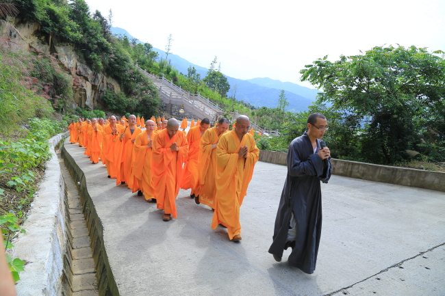 经过近40分钟的虔诚礼拜,队伍于8时许抵达拜佛台。稍事休息后,大众齐声称念佛号,又继续向大佛台经行而上。