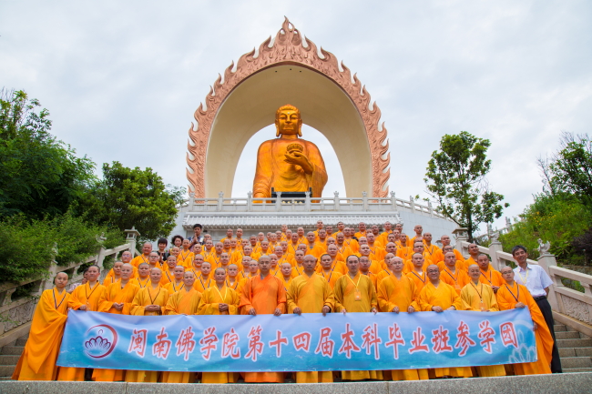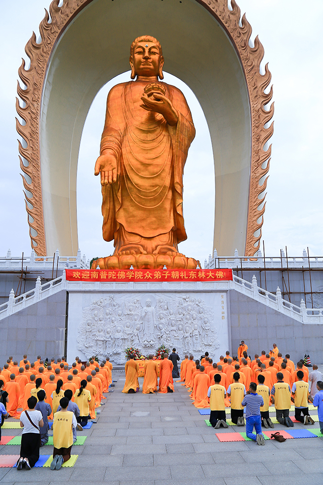 在结束了昨天的云居山之行后,他们于13日一早抵达了净土苑。心仪东林大佛已久,今朝得以亲临胜地,净土苑超然厚重的佛教氛围,古雅隽永的文化气息,巍峨庄严的大佛圣像,使学僧们均感心情愉悦,法喜充满。