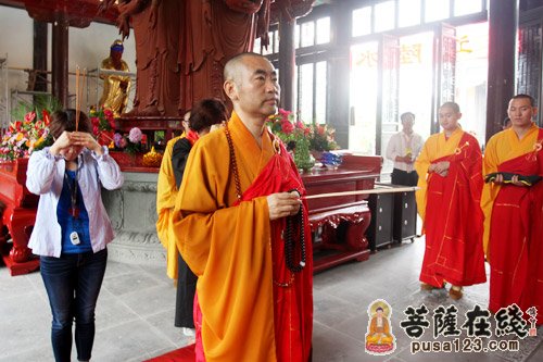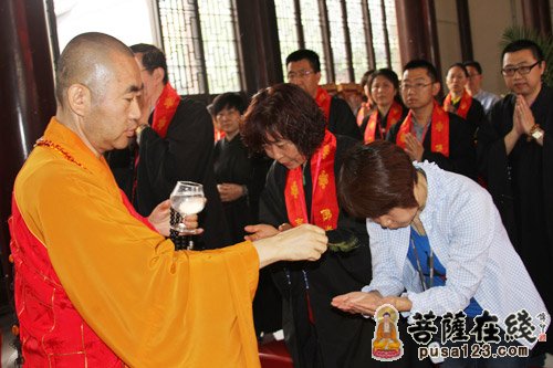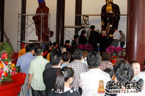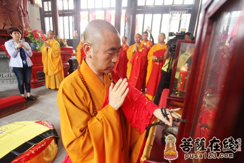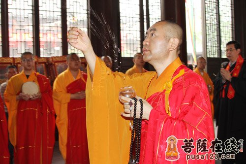 上午9时,平熙大和尚带领众功德主虔诚跪拜观世音菩萨,拈香礼佛,平熙大和尚手持杨枝净水,宣说观世音菩萨水文偈:“菩萨柳头甘露水,能令一滴遍十方,腥膻垢秽尽蠲除,令此坛场悉清净。”