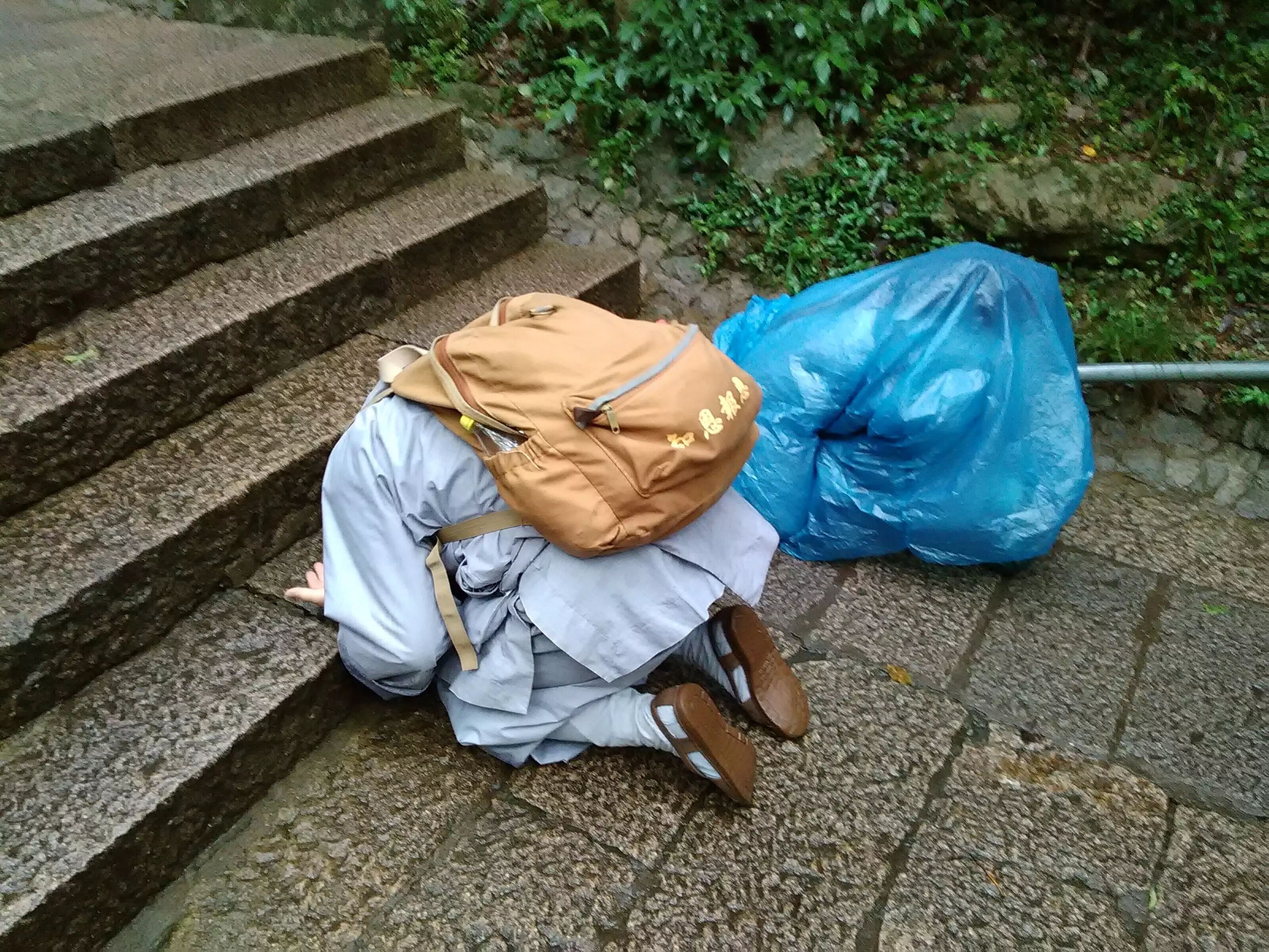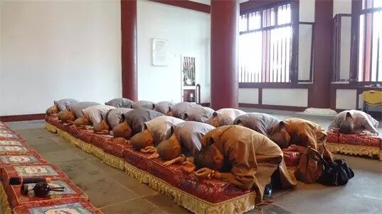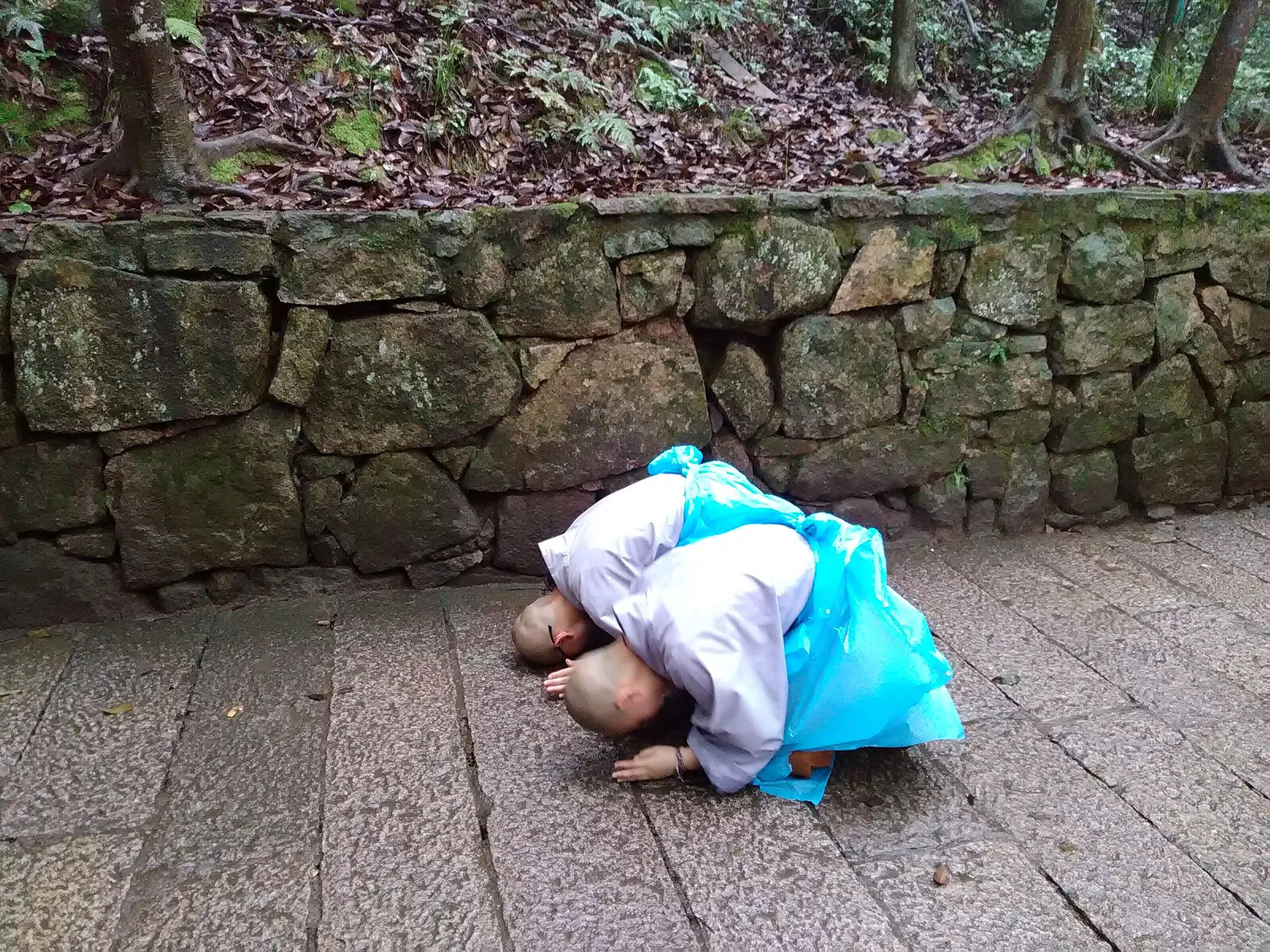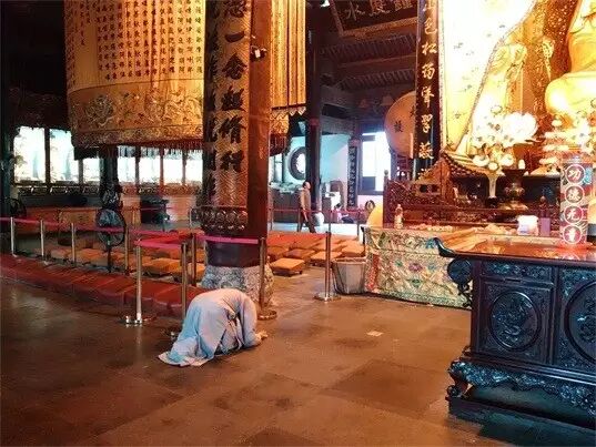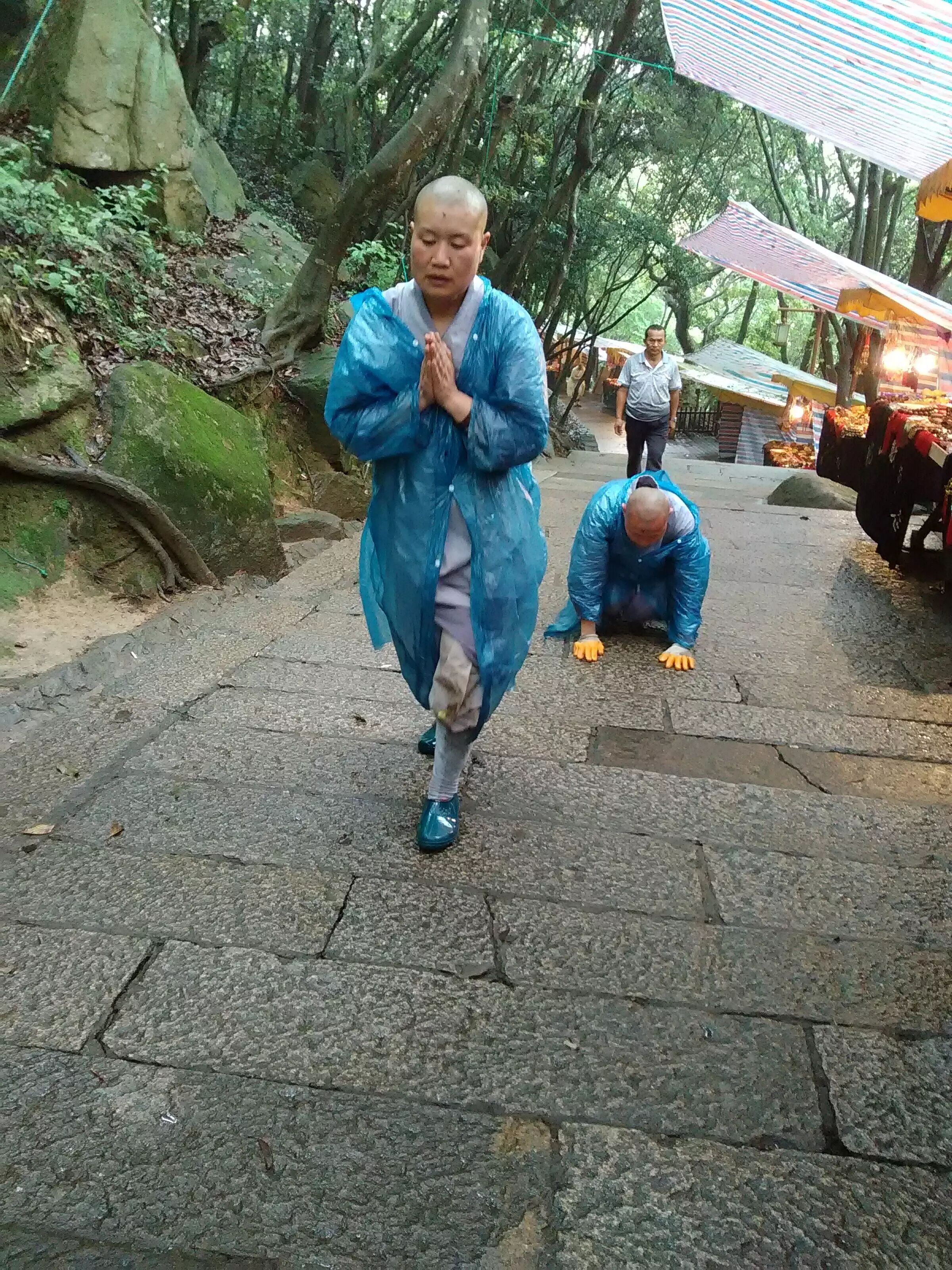 雨停后学僧恭敬三步一拜佛