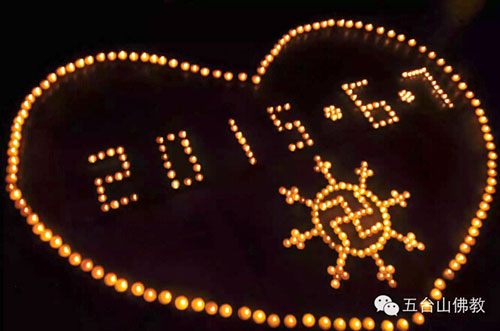 五方文殊殿堂内,一个用蜡烛摆成的“心”字图案,中间是卍字法轮和数字“2015.6.7”,表达了黛螺顶寺僧众对遇难者的哀思。痛定思痛,用佛教特有的方式,祈愿遇难者仗佛光明,蒙佛接引,乘佛慈力,早生净土,同往莲邦。